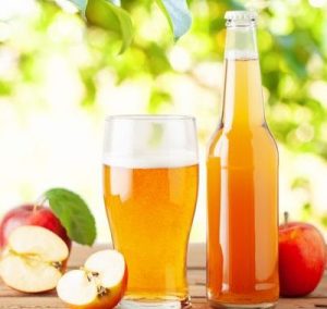 Boozy Refresing Cold Hard Apple Cider in a Pint Glass and Bottle on wooden table. Copy space