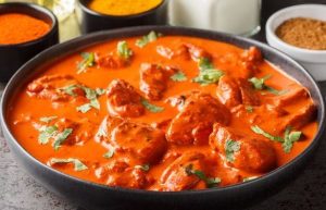 Delicious creamy chicken tikka masala surrounded by ingredients close-up in a bowl. horizontal