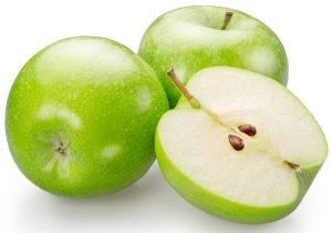 Two green apples and half of green apple on white background. File contains clipping path.