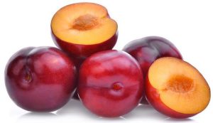 whole and half of red cherry plums isolated on white background